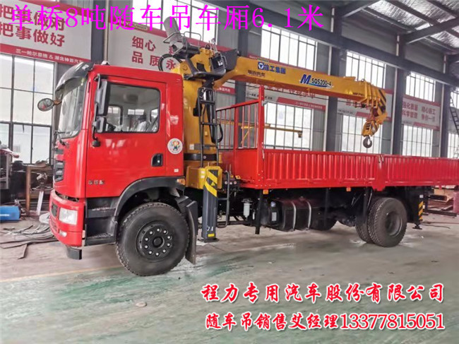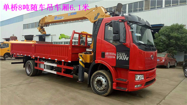 8噸單橋車廂6.1米解放隨車吊配置:單排駕駛室 ,配任何品牌8噸吊機(jī),徐工牌XZJ5182JSQJ5型隨車起重運(yùn)輸車貨廂尺寸(mm)6150×2450×600,整備質(zhì)量(Kg)11500.額定載質(zhì)量(Kg)6305.1000鋼絲胎,八檔變速箱.發(fā)動(dòng)機(jī)型號(hào)CA6DH1-22E5.中控鎖.帶隨車吊專用取力器及遠(yuǎn)程油門。