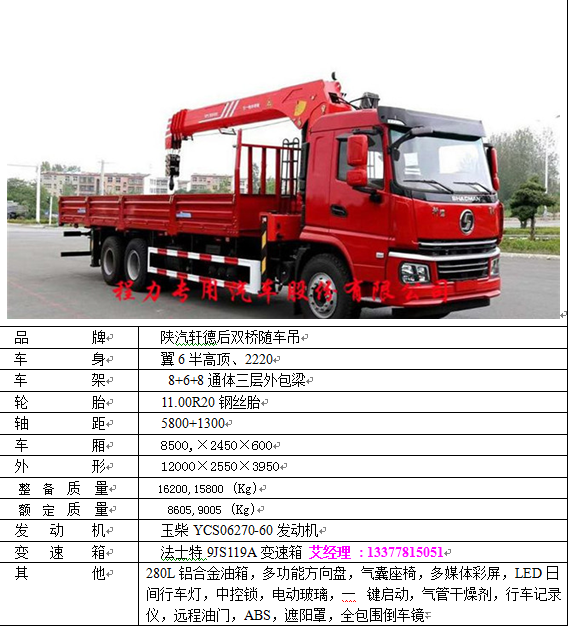 12噸14噸8噸10噸軒德翼6后雙橋隨車吊公告參數(shù):陜汽牌SX5250JSQGP6584型隨車起重運(yùn)輸車,公告批次333,總質(zhì)量(Kg)25000,額定載質(zhì)量(Kg)8605,整備質(zhì)量(Kg)16200,外形尺寸(mm)12000×2550×3950,貨廂尺寸(mm)8500×2450×600,駕駛室準(zhǔn)乘人數(shù)(人)3,最高車速(Km/h)85,發(fā)動(dòng)機(jī)型號(hào)YCS06270-60,軸距(mm)5800+1300,