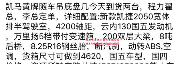 6.3噸5噸國(guó)五排放凱馬隨車吊,是最新款凱巴捷2050寬體排半駕駛室,整車寬度不超過2.25米,適合鄉(xiāng)村公路跑,總質(zhì)量(Kg)9995,額定載質(zhì)量(Kg) 3340,整備質(zhì)量(Kg)6460,凱馬牌KMC5102JSQA42P5型隨車起重運(yùn)輸車,底盤型號(hào) KMC1102A42P5,排放標(biāo)準(zhǔn) GB17691-2005國(guó)Ⅴ,GB3847-2005,4200軸距,國(guó)五隨車吊國(guó)五排放云內(nèi)130馬力發(fā)動(dòng)機(jī),萬(wàn)里揚(yáng)5檔帶副變速箱,200的雙層大梁,8噸的后橋,825R16鋼絲胎,斷汽剎,動(dòng)轉(zhuǎn),ABS,有空調(diào),貨廂4620×2100×550,也可以配多功能隨車吊帶自卸帶灑水帶工作斗帶清障等等。