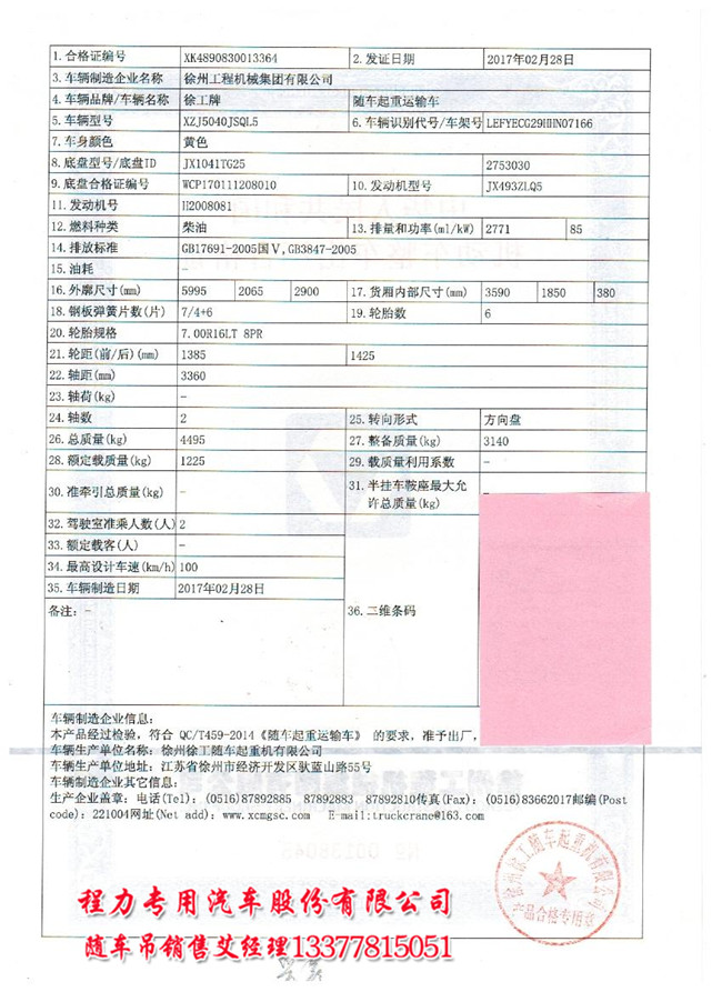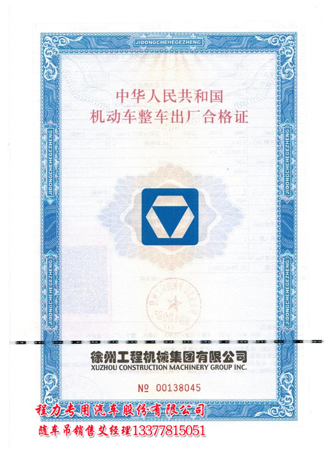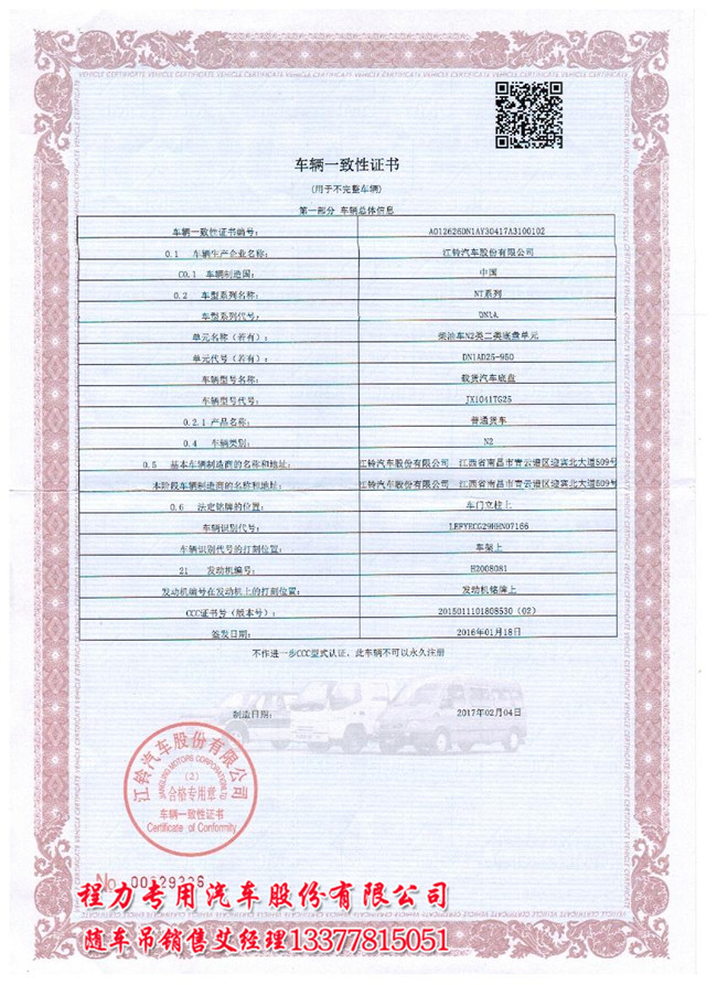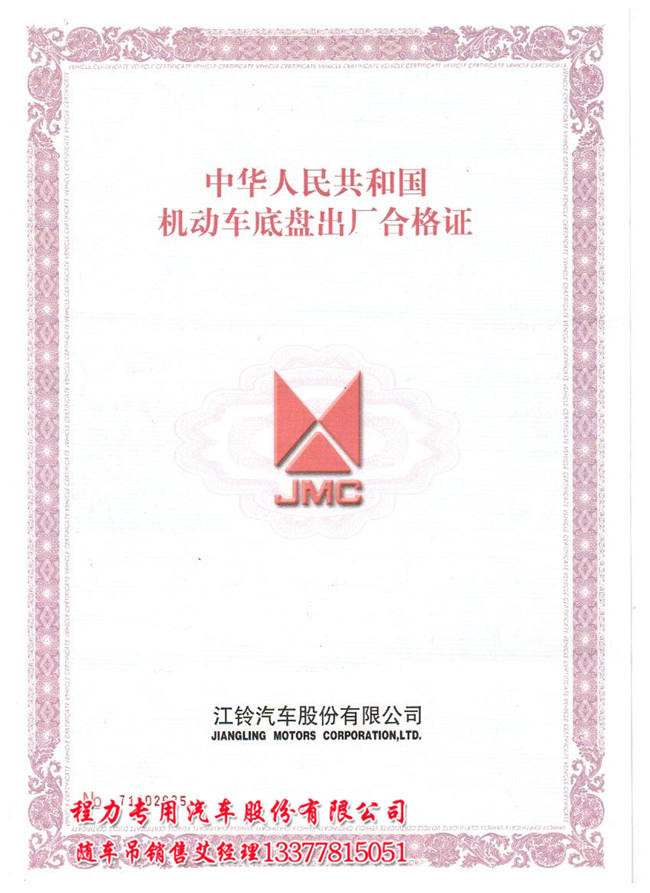 江鈴藍(lán)牌隨車吊整車合格證如上圖