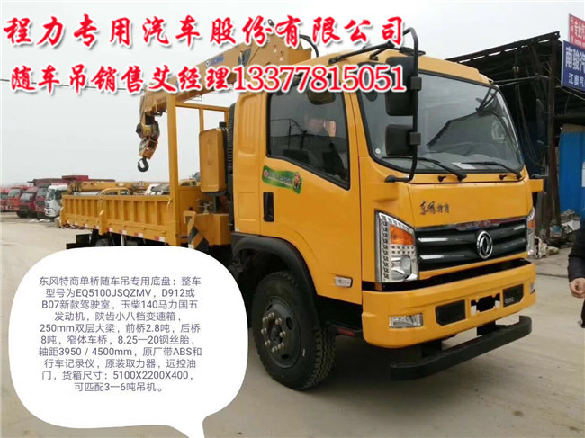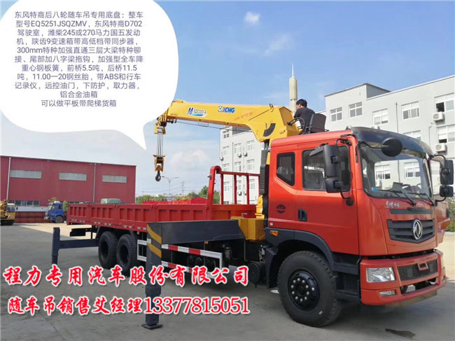 EQ5251JSQZMV國(guó)五隨車(chē)吊特商后八輪(后雙橋隨車(chē)吊)、濰柴245馬力(濰柴270馬力);東風(fēng)D702新款駕駛室. 陜齒9JS119變速箱,300MM三層直通大梁.專(zhuān)用隨車(chē)起重機(jī)底盤(pán)。此底盤(pán)可以做隨車(chē)吊平板帶爬梯。