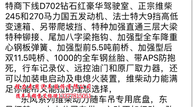 D702駕駛室東風(fēng)特商隨車(chē)吊玉柴東風(fēng)特商隨車(chē)吊濰柴東風(fēng)特商隨車(chē)吊:吊機(jī)可以配25噸20噸18噸16噸14噸12噸10噸8噸6.3噸5噸直折臂吊機(jī),說(shuō)到東風(fēng)特商國(guó)五隨車(chē)吊全國(guó)的用戶(hù)也許并不陌生,東風(fēng)特商隨車(chē)吊最大優(yōu)點(diǎn):特種加強(qiáng)直通三層大梁特種鉚接、尾部加八字梁拖鉤,加強(qiáng)型全車(chē)降重心鋼板簧,使整車(chē)承重更強(qiáng),也就是說(shuō)東風(fēng)特商隨車(chē)吊是很扎實(shí)的車(chē)型,也是高端產(chǎn)品。下面介紹產(chǎn)品: