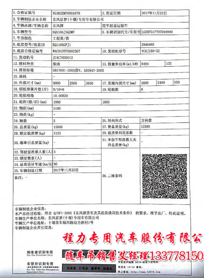 EQ5166JSQZMV/國(guó)五隨車(chē)吊/特商單橋/EQ1166GFJ1/YC6J180-52/東風(fēng)D702新款駕駛室. 陜齒9JS119變速箱,300MM三層直通大梁.前加強(qiáng)型前5.5噸,后雙加強(qiáng)11.5/13噸, 11.00全車(chē)鋼絲輪胎,原裝取力器。