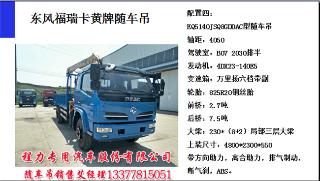 東風(fēng)福端卡隨車吊帶自卸主要配置:東風(fēng)牌EQ5140JSQ8GDDAC型隨車起重運輸車,4050軸距,一排半駕駛室,國五排放國五隨車吊14馬力錫柴發(fā)動機,825-20鋼絲胎,230的大梁專用底盤扎實,大廂做:4800×2000×600,現(xiàn)在的隨車起重運輸車都有ABS,方向助力,斷氣剎。