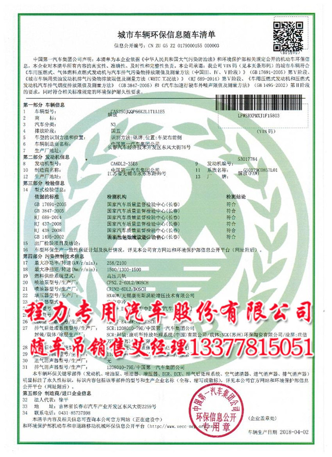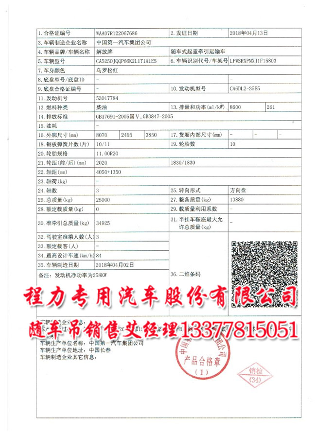 38噸、30噸、25噸、20噸、18噸、16噸解放J6牽引頭用戶提車時要看以下資料: