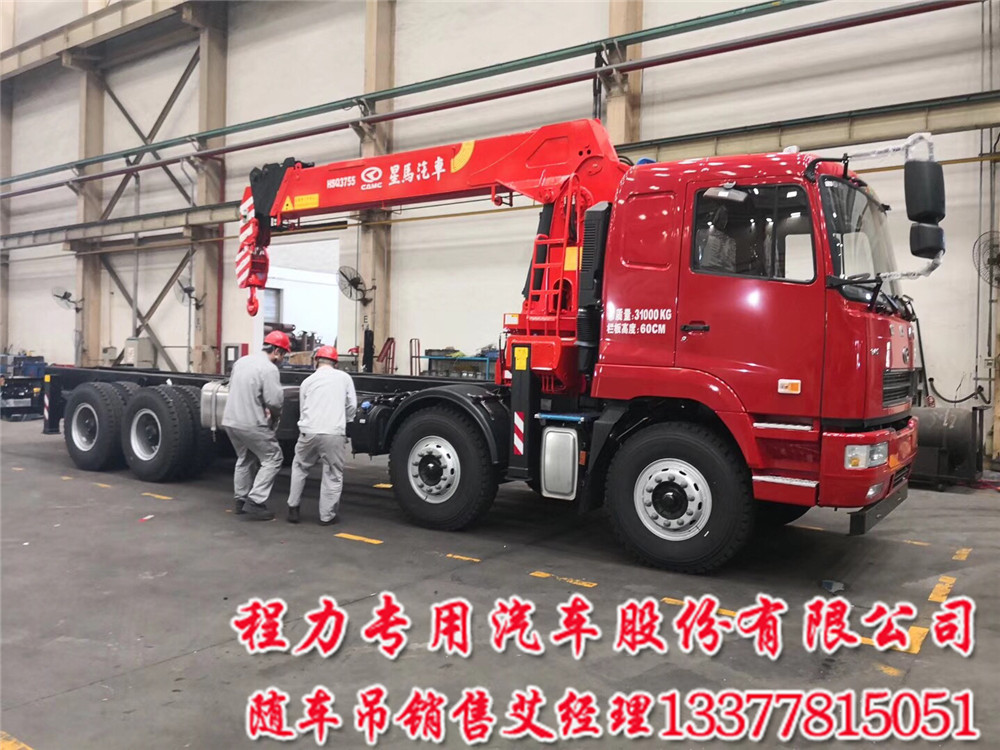 前四后八華菱隨車吊發(fā)動機300馬力,華菱之星平頂/變速箱12SOB2251A/車架290 8+5/軸距HL460(4.875)輕量化免維護中后橋2240+4215+1350/后橋/輪胎1100鋼絲胎.