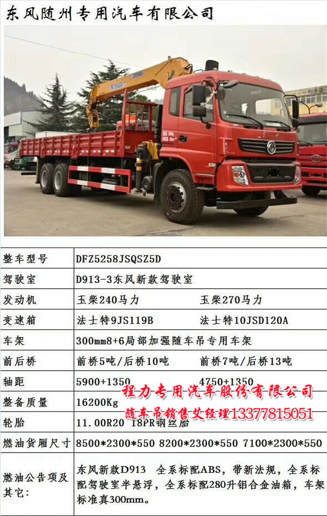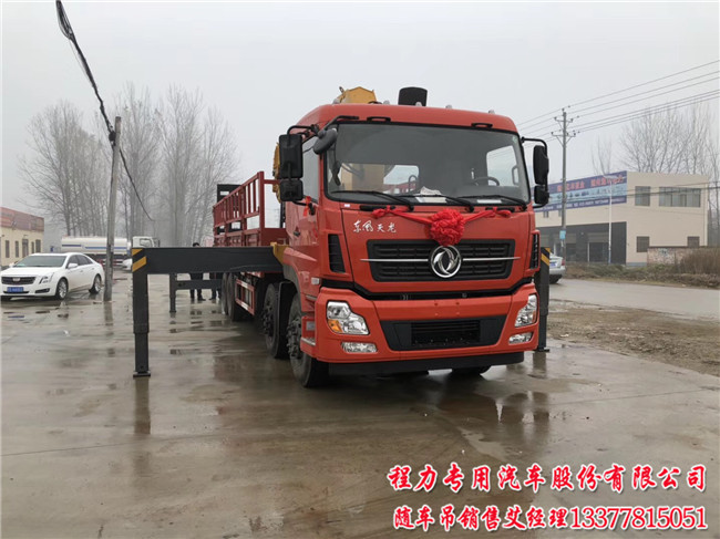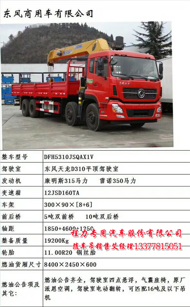 東風(fēng)天龍前四后八隨車吊配置:東風(fēng)天龍豪華駕駛室,法士特12檔,車架300mm雙層, 5T雙前橋/10T雙后橋,11.00R20,帶動力轉(zhuǎn)向、斷氣剎,帶空調(diào),可裝8-16噸吊機;