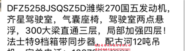 濰柴270馬力東風后雙橋隨車吊齊星駕駛室后雙橋隨車吊標配12噸吊機,鋁合金儲氣罐,帶ABS,帶動力轉,斷氣剎,D913車身豪華內飾,電動玻璃,法斯特9檔變速箱,車架300mm雙層(局部三層)直通大梁, 5T前橋/ 10T雙后橋,加厚鋼板,11.00R20鋼絲胎.