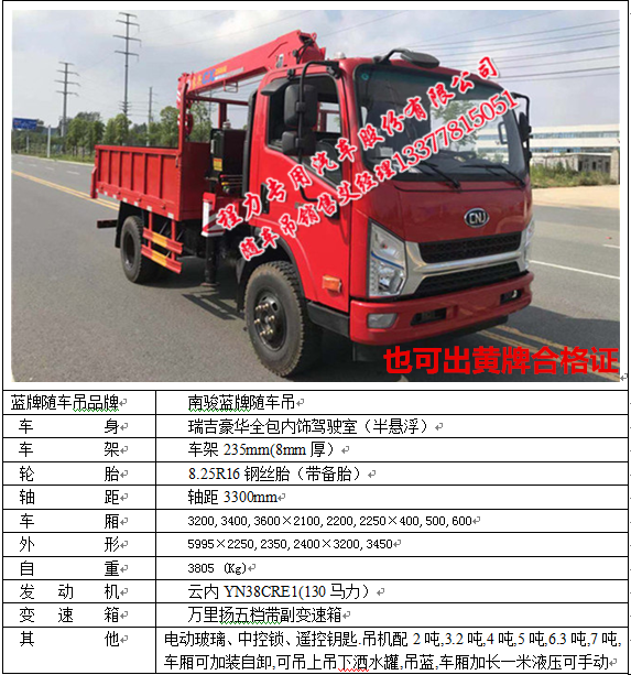 藍牌隨車起重運輸車加裝配置:自卸,灑水罐,吊藍,四驅(qū),后托臂清障,加長到4.2米貨廂,拉電桿貨廂,配折臂吊機可夾木夾竹,夾鐵夾生活垃圾夾具。