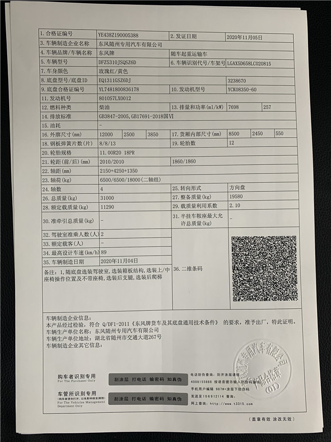 青島黃牌隨車吊錦程電話_青島黃牌前四后八錦程隨車吊_青島黃牛電話配置一:新規(guī)YC6A290-50玉柴發(fā)動機,東風(fēng)隨專前四后八隨車吊 東風(fēng)新款齊星豪華駕駛室,四點懸浮,氣囊座椅,電動玻璃,法士特10檔變速箱高低檔,車架300mm通體三層大梁, 5T雙前橋/ 10T雙后橋, 11.00R20鋼絲胎,鋁合金油箱,帶ABS,帶動力轉(zhuǎn),斷氣剎,下防護,取力器。