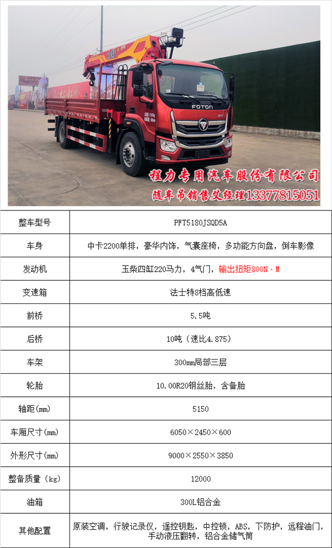 PFT5180JSQ另一款新品:6.1米貨廂單排福田奧鈴8噸隨車吊配置:玉柴YC4EG220發(fā)動機_帕菲特牌FT5180JSQD5A型隨車起重運輸車_前橋5.5噸,后橋10噸_倒車雷達,多功能方向盤_法士特小8擋變速箱_300mm局部三層大梁_車廂6050內(nèi)尺寸_整車尺寸9000*2550*3850_空調,氣囊座椅,遙控鑰匙_10.00R20鋼絲胎_原廠取力器,遠程油門,中控鎖,電動門窗.