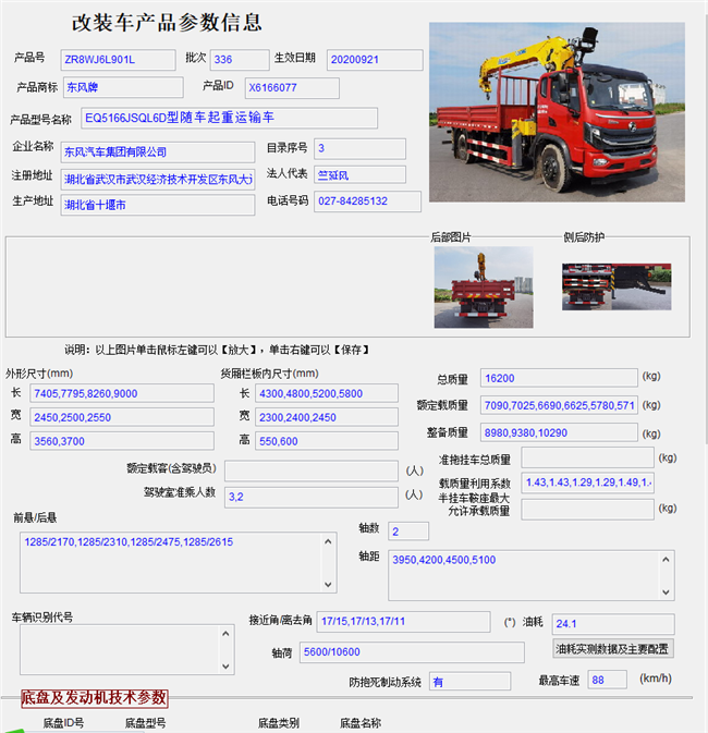 6.3噸7噸8噸T3短軸距隨車吊_T3國六短軸距隨車吊參數(shù):東風(fēng)牌EQ5166JSQL6D型隨車起重運(yùn)輸車,總質(zhì)量(Kg) 16200,額定載質(zhì)量(Kg)7090,7025,6690,6625,5780,5715外形尺(mm)8260×2550×3560,整備質(zhì)量(Kg)10290,軸距(mm) 4500,最高車速(Km/h)88,排放標(biāo)準(zhǔn)GB17691-2018國ⅥYCS04200-68發(fā)動(dòng)機(jī)。輪胎規(guī)格9.00R20 16PR。