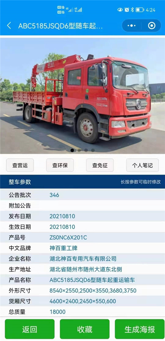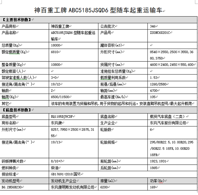 雙排隨車吊_8噸東風(fēng)D9雙排隨車吊公告參數(shù):神百重工牌ABC5185JSQD6型隨車起重運(yùn)輸車軸距(mm)4700車外形尺寸(mm) 8540×2550,2500×3550,3680,3750貨廂尺寸(mm)4600×2400,2450×550,600后輪距(mm) 1865