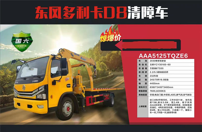 新品來了-國六D8多利卡一拖二帶吊清障車5噸四噸隨車吊清障車配置:D8(國六)帶空調(diào)電動門窗中控鎖,斷氣剎(清障帶吊機(jī)),AAA5125TQZE6多利卡D8,玉柴YCY30165,165馬力,4400軸距距,245真空胎,萬里揚(yáng)6檔變速箱,230車架,3/6橋。