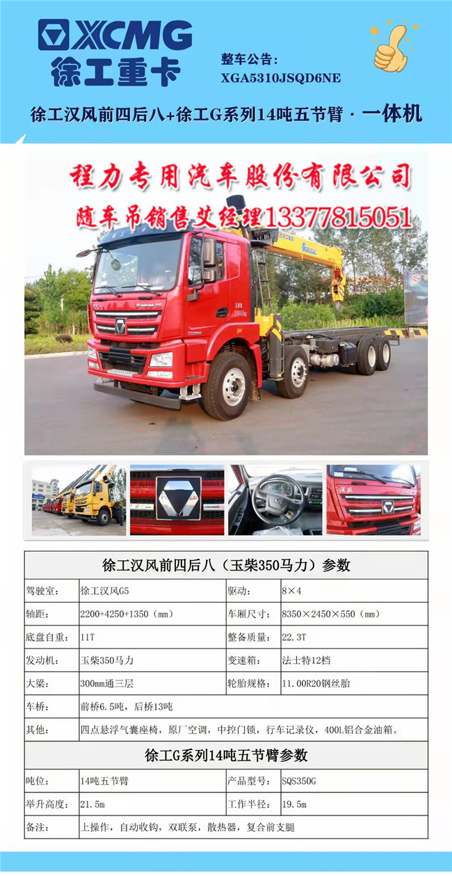 徐工14噸16噸G型一體化漢風(fēng)前四后八隨車吊徐工漢風(fēng)前四后八(8X4)玉柴350馬力,徐工漢風(fēng)G5駕駛室,四點(diǎn)懸浮氣囊座椅,11.00R20鋼絲胎,原廠空調(diào),中控門鎖,行車記錄儀,400L鋁合金油箱。(備注:底盤(pán)自重11T,整備質(zhì)量22.3T,車廂尺寸8350X2450X550)。法士特12檔變速箱,前橋6.5噸,后橋13噸,300mm通三層大梁,軸距2200+4250+1350,