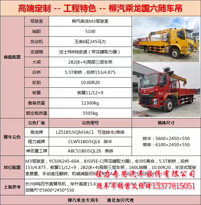 乘龍8噸隨車吊詳細(xì)參數(shù):乘龍牌LZ5185JSQM3AC1型隨車起重運(yùn)輸車,【主要技術(shù)參數(shù)】產(chǎn)品商標(biāo)乘龍牌,公告批次322,產(chǎn)品號(hào)ZPC3T67N01X,總質(zhì)量(Kg)18000,額定載質(zhì)量(Kg)5505,外形尺寸(mm)9000×2550×3700,3800,整備質(zhì)量(Kg)12300,貨廂尺寸(mm)5800,5600×2450×550,駕駛室準(zhǔn)乘人數(shù)(人)3,載質(zhì)量利用系數(shù)1.04,接近角/離去角(°)20/12,前懸/后懸(mm)1445/2455,軸數(shù)2 軸距(mm)5100,軸荷(Kg)6500/11500,最高車速(Km/h)90,其它選裝照片1:選裝M3B駕駛室新面板,選裝導(dǎo)風(fēng)板,選裝前面板亮條,選裝A柱貼膜,選裝保險(xiǎn)杠、翼子板,選裝后視鏡,選裝車門下飾板,選裝臥鋪側(cè)窗,選裝綠玻璃,選裝導(dǎo)流罩;選裝照片2:選裝箱板結(jié)構(gòu);選裝照片3:選裝隨車起重機(jī)不帶座椅,選裝不帶隨車起重機(jī)后支腿,選裝隨車起重機(jī)中位座椅和高位座椅,選裝隨車起重機(jī)后支腿,選裝折臂式起重機(jī).吊機(jī)重量(kg)/最大起升載荷(kg)分別為:1, (HCS200A-5):3500/8000; 2,(SQS200,SPS20000,URV800,SQ804, 發(fā)動(dòng)機(jī)型號(hào)YCS06245-60A廣西玉柴機(jī)器股份有限公司。