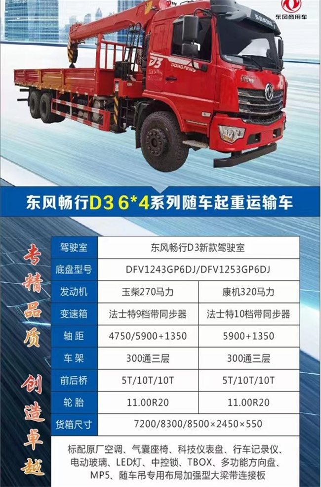 12噸短軸距暢行D3后八輪隨車吊7.2米/8.3米貨廂后雙橋短軸距隨車吊可選,先說說為什么選后雙橋短軸距隨車吊,整車短(10米左右)好拐彎,主要用于工地及農(nóng)村路,后雙橋短軸距隨車吊保住了25噸總質(zhì)量及自重輕些,也可選320馬力與270馬力玉柴可選,路況不好時(shí),下雨天路不好駛時(shí),大馬力的優(yōu)點(diǎn)。