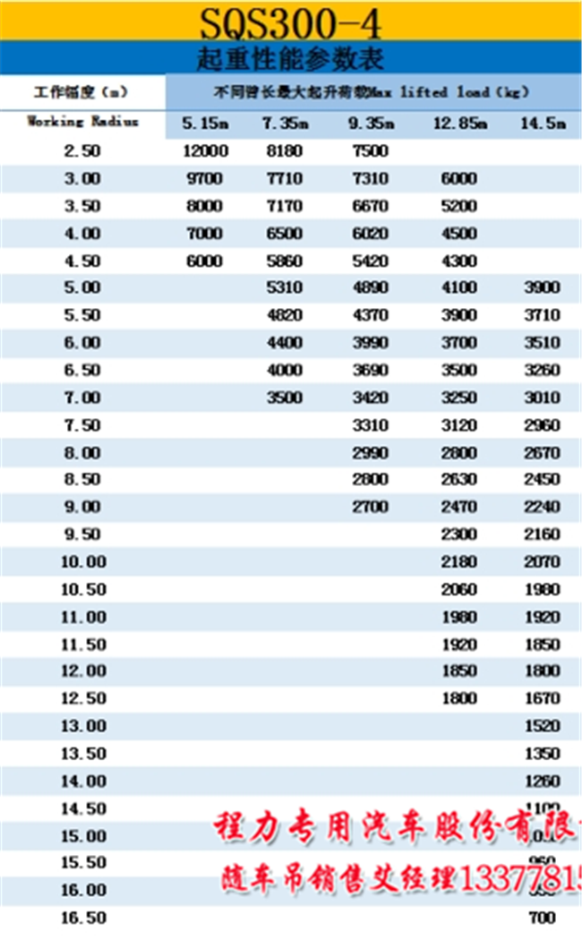 三看大力神后雙橋大力神12噸隨車吊吊機參數(shù)表:12T四節(jié)臂,吊機額定吊載質(zhì)量(Kg):12000,額定起重(T.m)30,最大工作幅度(m):13.5,最大起升高度(以支腿全伸地面為基準(zhǔn))(m):15.5米起重臂基本臂長(m):5.0 ,起重臂全伸臂長(m):13.5 起重臂節(jié)數(shù): 4 ,基本臂截面形式:六邊形 ,回轉(zhuǎn)角度(°):360 ,支腿跨度(全縮/全伸)(m): 2.4/5.7 ,推薦系統(tǒng)流量(L/min):72,系統(tǒng)額定壓力(Mpa): 26 ,操作方式:上位操作 ,工作半徑-最大起吊質(zhì)量,三看都看明白了,購車就放心了。