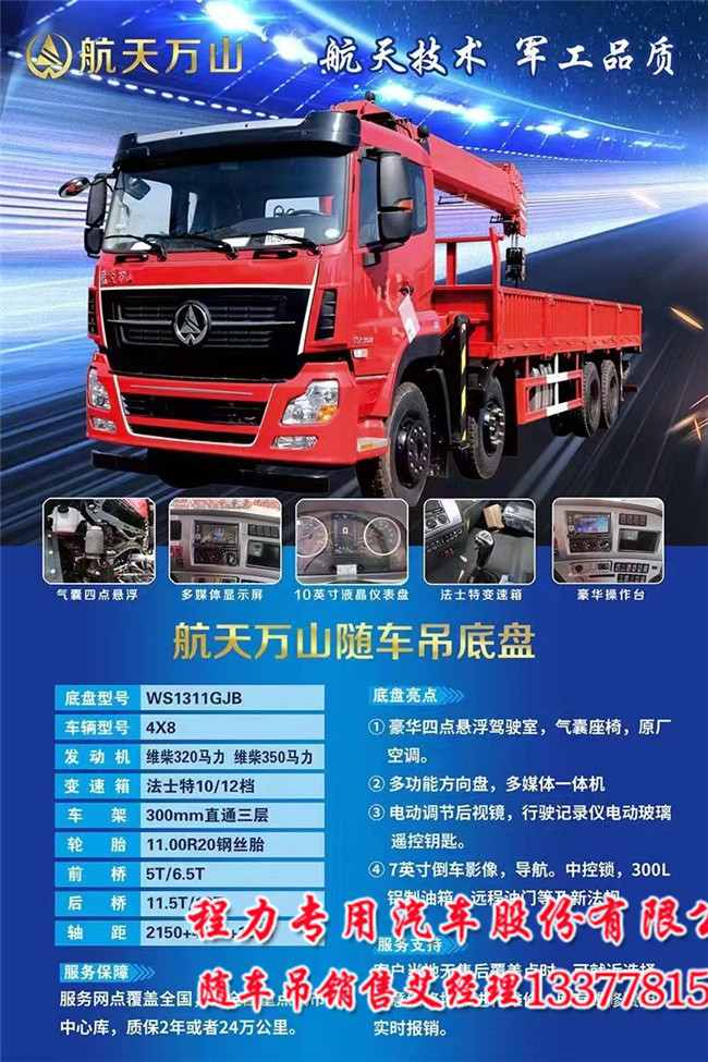 航天萬(wàn)山14噸16噸前四后八隨車吊底盤質(zhì)保2年或24萬(wàn)公里配五環(huán)大力神吊機(jī)_徐工_三一_宏昌天馬等品牌吊機(jī),因此航天萬(wàn)山隨車吊是新產(chǎn)品,其發(fā)動(dòng)機(jī)是濰柴,前后橋加大,因新來(lái)市場(chǎng),為了打開市場(chǎng),廠家把底盤價(jià)格降低來(lái)打回潰用戶,因此整車價(jià)格在相當(dāng)車型中實(shí)惠款。
