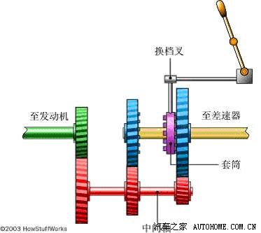 掛進(jìn)1檔時(shí),套筒就和右邊的齒輪(藍(lán)色)嚙合。見(jiàn)下圖:
