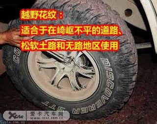 越野花紋的共同特點是花紋溝槽寬而深,花紋塊接地面積比較小(約40%~60%)。在松軟路面上行駛時,一部分土壤將被嵌入花紋溝槽之中,必須將嵌入花紋溝槽的這一部分土壤剪切之后,輪胎才有可能出現(xiàn)打滑。據(jù)測試:在泥濘路上,同一車型的車輛使用越野花紋的牽引力可達(dá)普通花紋的1.5倍。