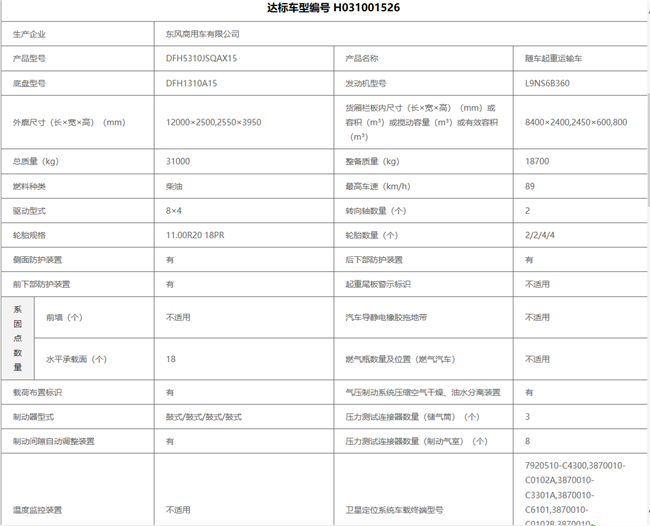 底盤型號:DFH5310JSQAX15 額定質量:12170