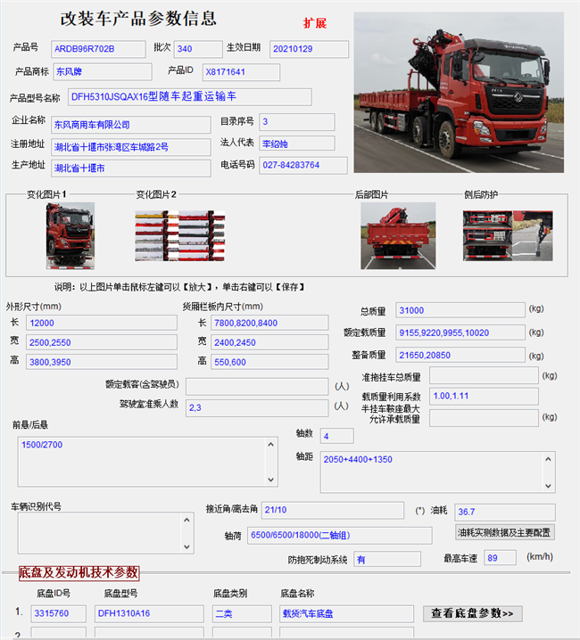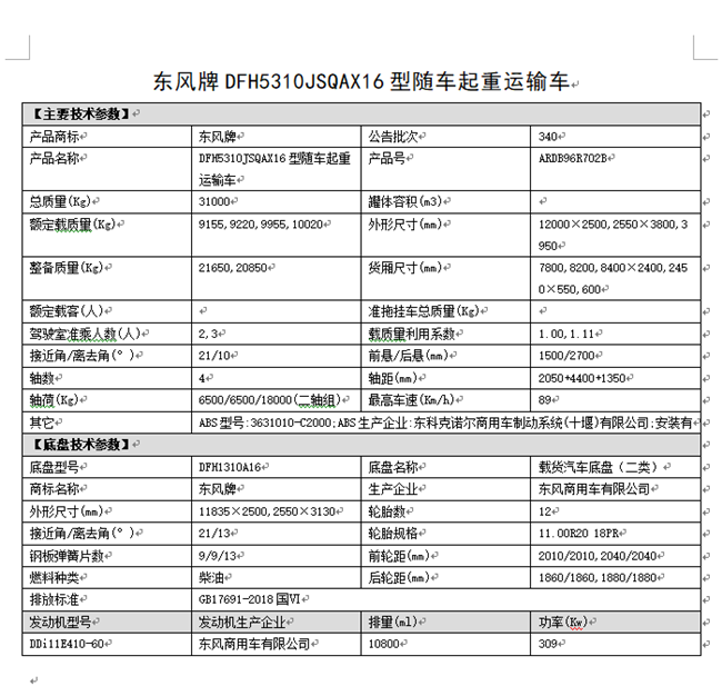 東風(fēng)天龍前四后八隨車吊折臂:300mm局部三層車架、前橋雙7噸、21650kg,20850kg,D310-S駕駛室、東風(fēng)DDi11E410-60發(fā)動(dòng)機(jī)、東風(fēng)14檔變速箱、軸距2050+4400+1350、后橋雙16噸、11.00R20鋼絲胎。東風(fēng)天龍DFH1310A16。