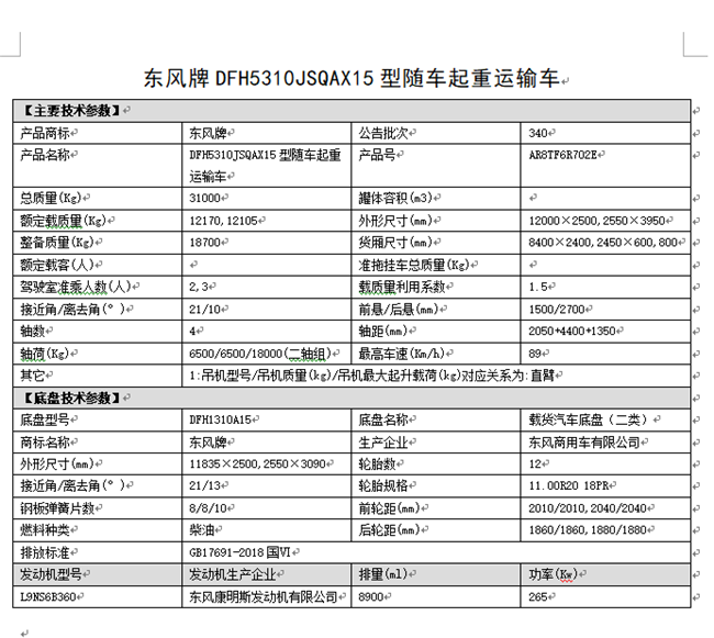 東風(fēng)天龍前四后八隨車吊直臂:前橋雙5.5噸、后橋雙10噸、11.00R20鋼絲胎。18700kg,D310-S駕駛室、康明斯L9NS6B360發(fā)動(dòng)機(jī)、東風(fēng)14檔變速箱、軸距2050+4400+1350、300mm局部三層車架、東風(fēng)天龍DFH1310A15。