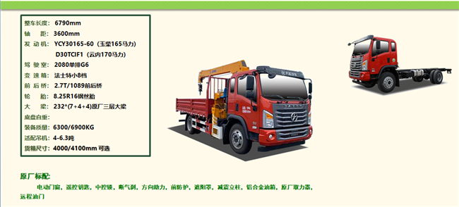 4米車廂3.6米短軸距大運隨車吊配置:軸距3600,2080新款G6單排駕駛室,萬里揚六檔帶副變速箱,D25TCIF1,云內(nèi)150馬力發(fā)動機,2.3/7噸縮短橋,8.25R16鋼絲胎,200×(7+4+4)原廠局部三層大梁,160L鋁合金油箱。