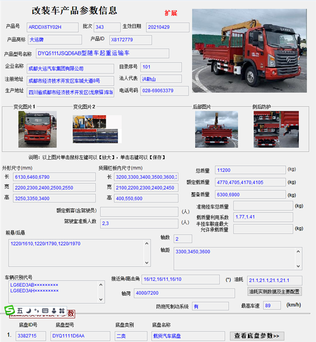 底盤型號:DYQ5111JSQD6AB 額定質(zhì)量:4770