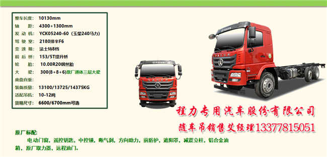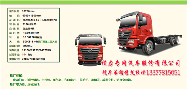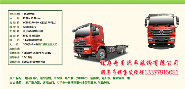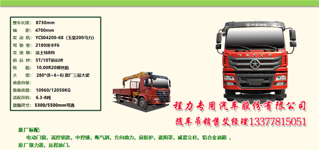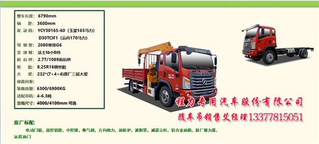 五款大運(yùn)隨車吊之一:短軸距后雙橋隨車吊,做到整車短,車廂短至6.7米。吊機(jī)配到14噸。
