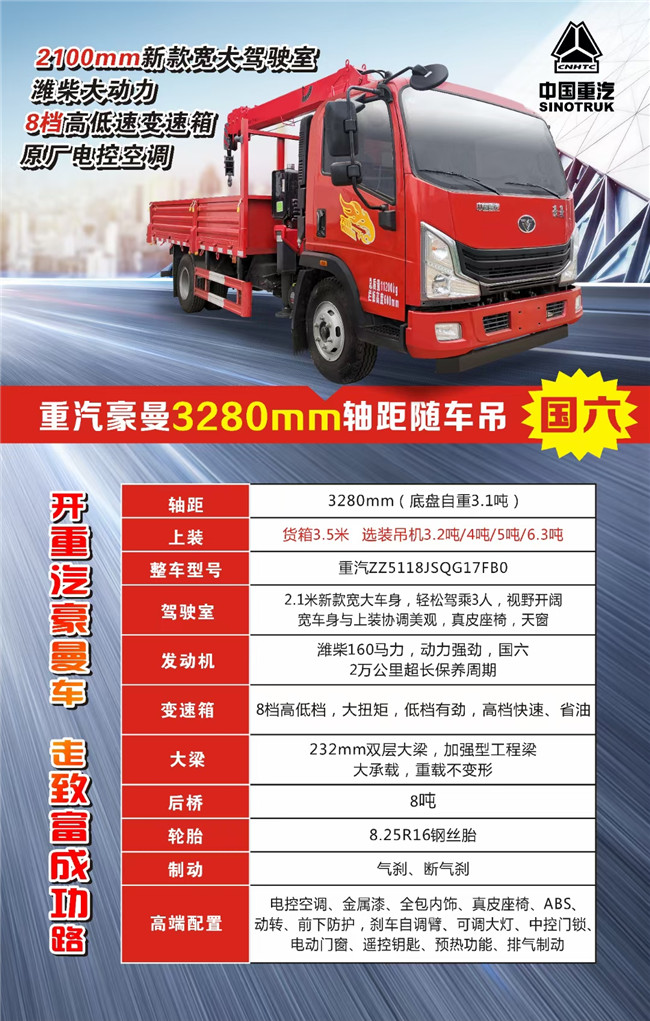 五款豪曼隨車吊3.2噸4噸5噸6.3噸7噸8噸吊機可配,國六發(fā)動機160馬力和190馬力濰柴,這幾款都適合鄉(xiāng)村公路,用于農(nóng)電改造,從3.28米軸距至4.5米軸距,吊機配3.2噸至8噸都可正常上牌。