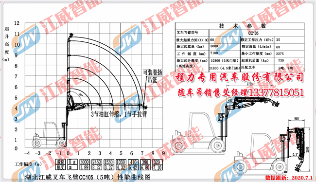 5噸叉車吊大臂長7.1米,在1.89米吊3噸,2.27米吊2.45米,在3.27米吊1.53噸,在4.32米吊1噸,5.42米吊0.47噸,6.8米吊0.37米,7.1米吊0.32噸?梢耘湓4噸及4噸以上的叉車上正常使用。