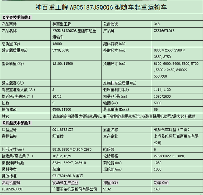 8噸上汽紅巖隨車(chē)吊配置:玉柴240馬力六缸杰豹H6駕駛室,平頂短、氣囊座椅,電動(dòng)后視鏡帶加熱、多功能方向盤(pán),遙控中控鎖、自動(dòng)空調(diào)、手動(dòng)翻轉(zhuǎn)、機(jī)械懸置,遠(yuǎn)程油門(mén),200L圓形鋁合金油箱,5.0T11.5T,5000軸距,940/865*280*(8+8)車(chē)架,11.00R20 PR18帶8.0鋼圈,陜齒8檔,