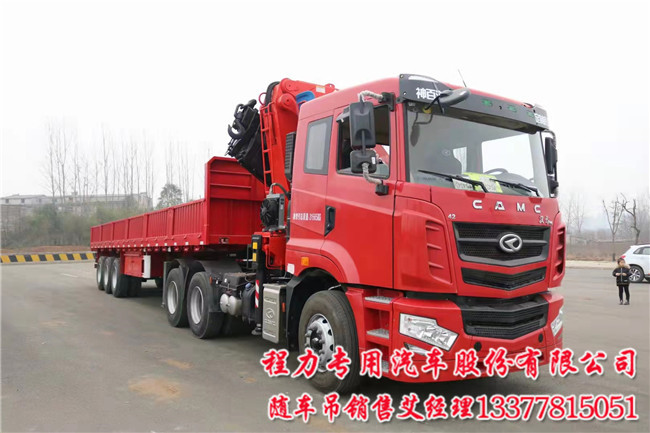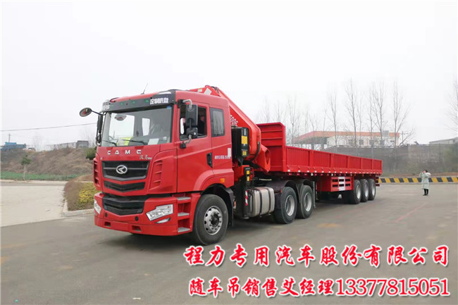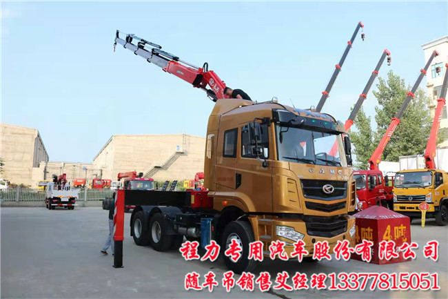 華菱牽引頭帶吊配折臂好還是配直臂好,廠家見意配折臂,其一可以當(dāng)汽車吊用(要加配重),折臂在不用時折在車頭后面,不占掛車空間,半掛可以拉貨至4米以下。