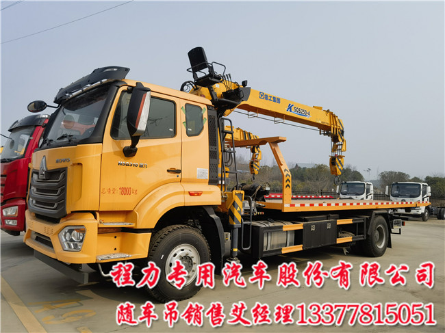 重汽豪沃8噸隨車吊拖車一拖二平板救援車底盤配置:WP6H245E61發(fā)動機,6220Lm排量,功率180Kw,245馬力;HW95508STC變速箱+HW45ZC法蘭式取力器;H653自調(diào)臂前軸(鼓);MCJ11BG自調(diào)臂單后橋(鼓);速比4.11;雙層車架(8+5/280);前后加強版多片簧(11/9+8);國產(chǎn)方向機;