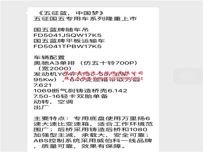 東風福瑞卡藍牌隨車吊、江鈴單雙排藍牌隨車吊、王牌藍牌隨車吊、唐駿歐鈴多功能隨車吊。凱馬藍牌隨車吊、五征(奧馳)藍牌隨車隨車起重運輸車、可以配5噸上藍牌東風福瑞卡加強版隨車吊、歐馬可藍牌隨車吊、東風雙排藍牌隨車吊、江淮藍牌隨車吊、大運藍牌隨車起重運輸車,還有一款免征王牌藍牌隨車吊,這里是藍牌隨車吊大薈萃。(上藍牌隨車吊整車長度不超過6米,總質(zhì)量不超過4.5噸,上戶噸位不超過1.5噸)藍牌隨車起重運輸車銷售艾經(jīng)理電話:13377815051