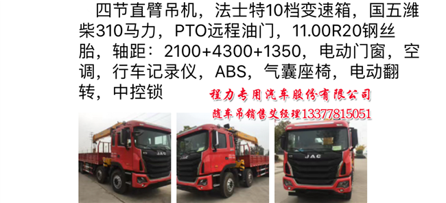 16噸14噸江淮前四后八隨車吊配置:江淮牌HFC5311JSQYP1K4H43V型隨車起重運(yùn)輸車,法士特十檔變速箱,濰柴310馬力WP10.310E53國五隨車吊,TPO運(yùn)程油門,1100R20鋼絲胎,軸距2100+4300+1350,電動(dòng)門窗,空調(diào),行車記錄議,ABS,氣囊座椅配不同吊機(jī),隨車吊價(jià)格也不同。請(qǐng)打圖片上電話咨詢更多。