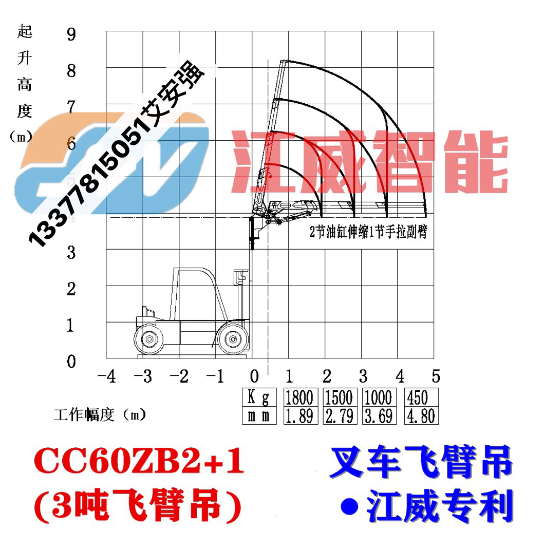 3噸叉車飛臂吊機(jī):最大工作4.644米,全部升出可吊0.8噸,高度9米-10米。