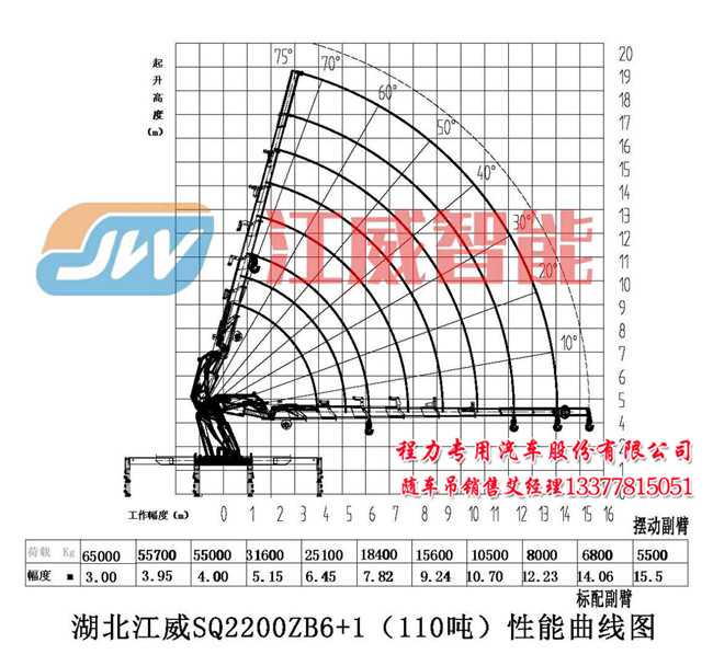 55噸全折臂江威隨車吊價(jià)格按用戶要求來核算,上圖是110噸全折吊機(jī)曲線圖,在不同大臂申長度所吊貨物也不同,用戶在購車前一定要明白吊機(jī)的性能.