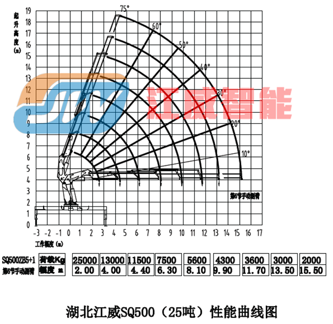 以下是SQ500江威25噸折臂江威隨車吊5+1是五節(jié)申縮臂加一節(jié)手動臂