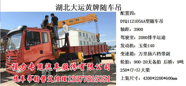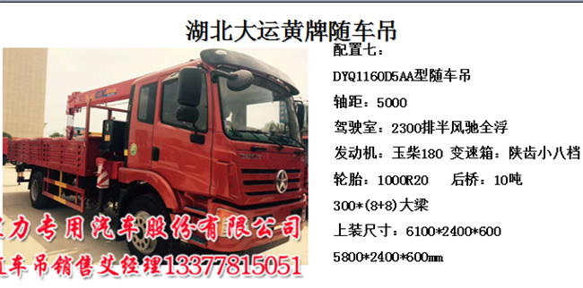 湖北大運隨車吊配130馬力140馬力160馬力180馬力發(fā)動機可選,吊機配10噸-3.2噸直折臂,車廂是與大運隨車吊軸距相關(guān),軸距長,車廂長,你要哪一款大運隨車吊?