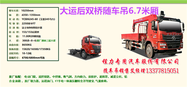 DYQ大運(yùn)后雙橋隨車(chē)吊配置:玉柴240馬力玉柴270馬力,5850+1350軸距,2150大運(yùn)F7駕駛室,陜齒大九檔變速箱,5噸前橋,10噸雙后橋,11.00R20鋼絲胎,300*(8+8+6)原廠通體三層大梁,氣囊座椅,液壓翻轉(zhuǎn)隨車(chē)吊.
