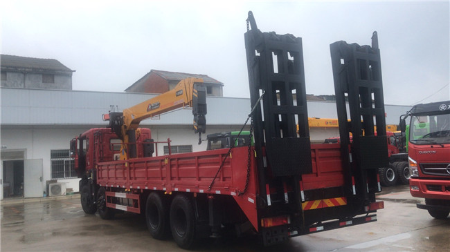 16噸14噸程力專汽隨車吊-T5前四后八隨車吊平板運輸車:發(fā)動機可選270馬車與290馬力,拉30噸左右挖機,拉挖機車廂可左右申縮到3米,后爬梯可一節(jié)或二節(jié),可手動可液壓。