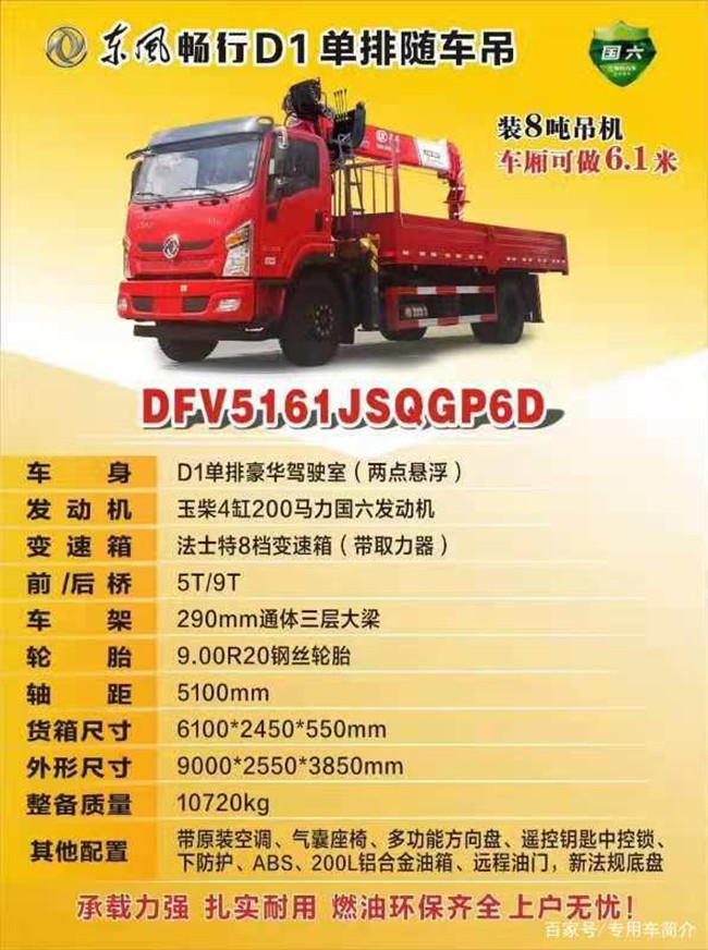 國(guó)六單排暢行6米1貨廂隨車(chē)吊_6.1米暢行8噸D1隨車(chē)吊:D1豪華內(nèi)飾駕駛室,四合一遙控門(mén)鎖,行車(chē)記錄儀,原廠(chǎng)空調(diào),國(guó)六玉柴200/180馬力發(fā)動(dòng)機(jī),